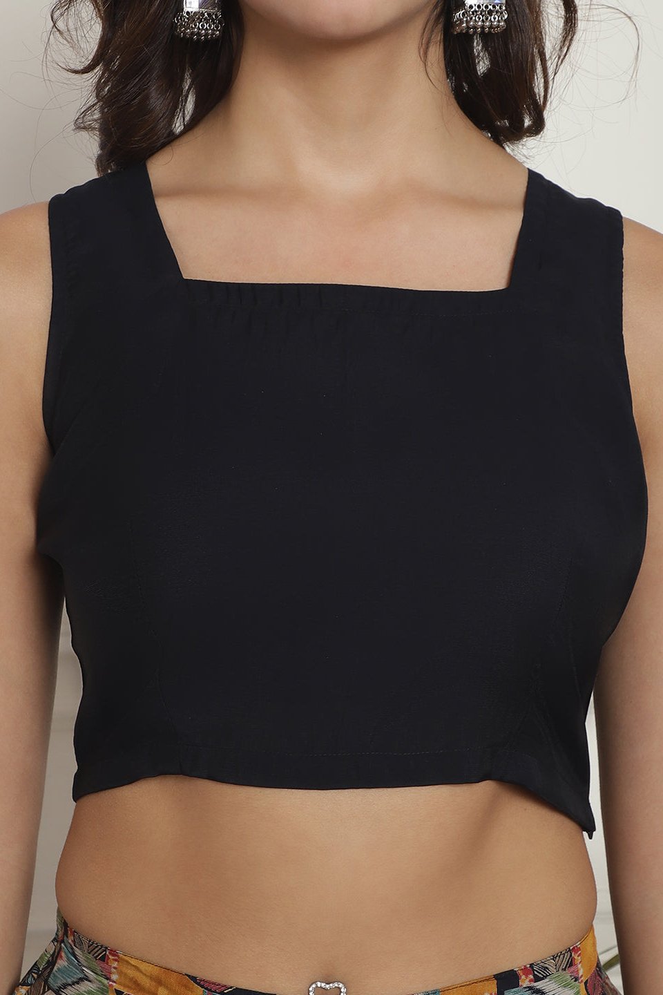 Black solid top, has square neck, sleeveless ,regular waist hem