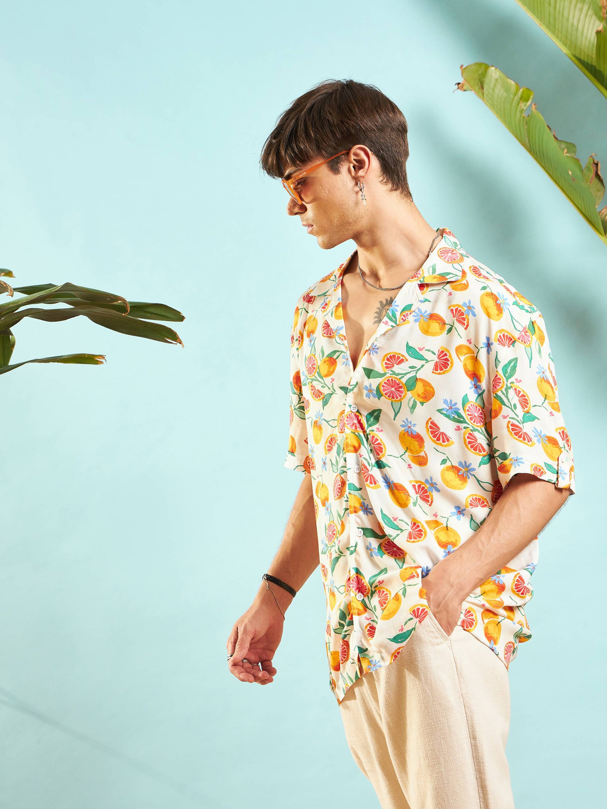 Beige Fruit Print Relax Fit Shirt, in Rayon fabric, NA, Regular Length, Relax Fit, Button Closure, Straight Hemline and features Box Pleat Detail At Back