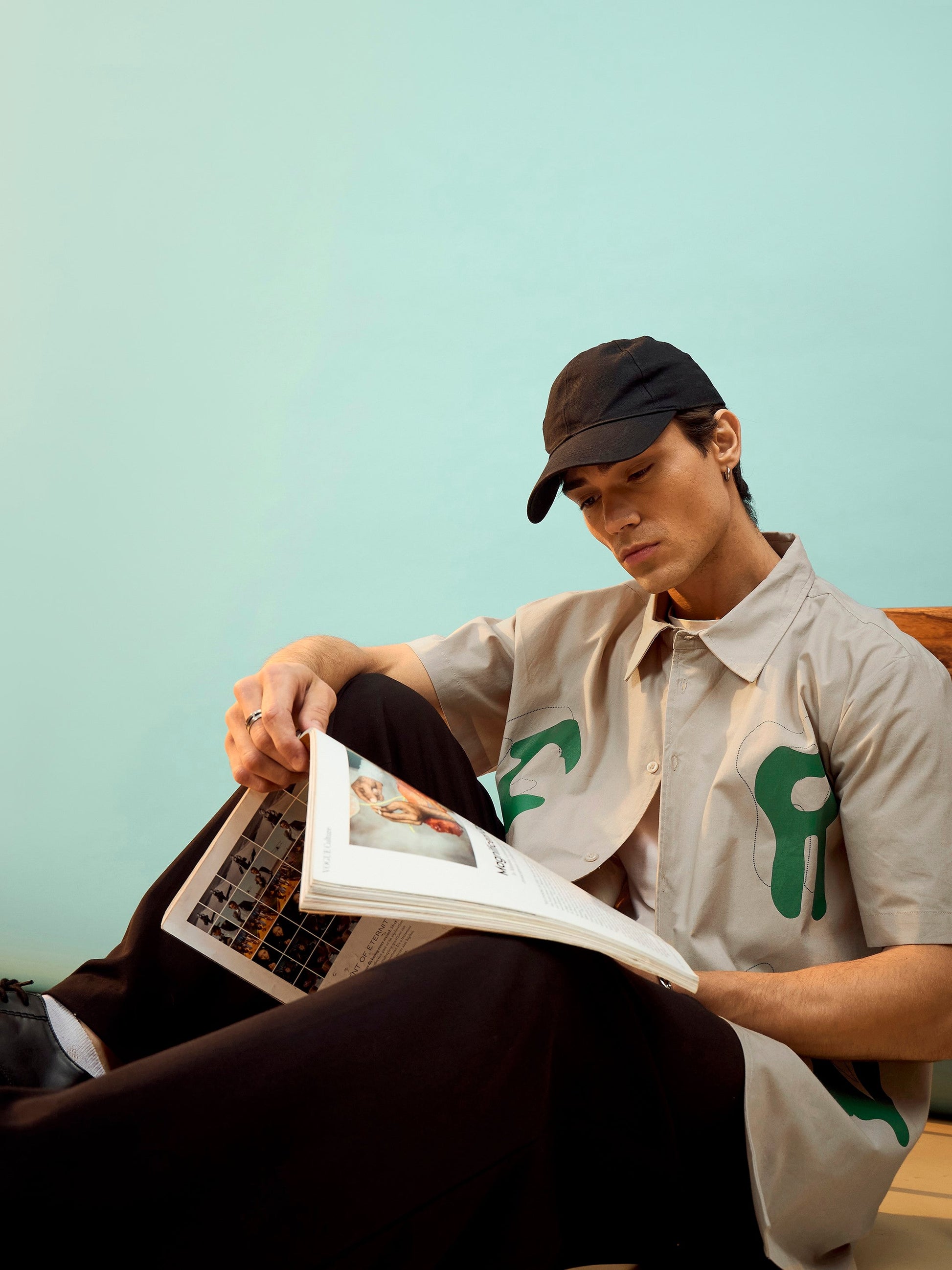 Beige Poplin CREW Oversize Shirt, in Poplin fabric, Unlined, Regular length, Oversize Fit, Button Closure, Straight Hemline and features Print At Front