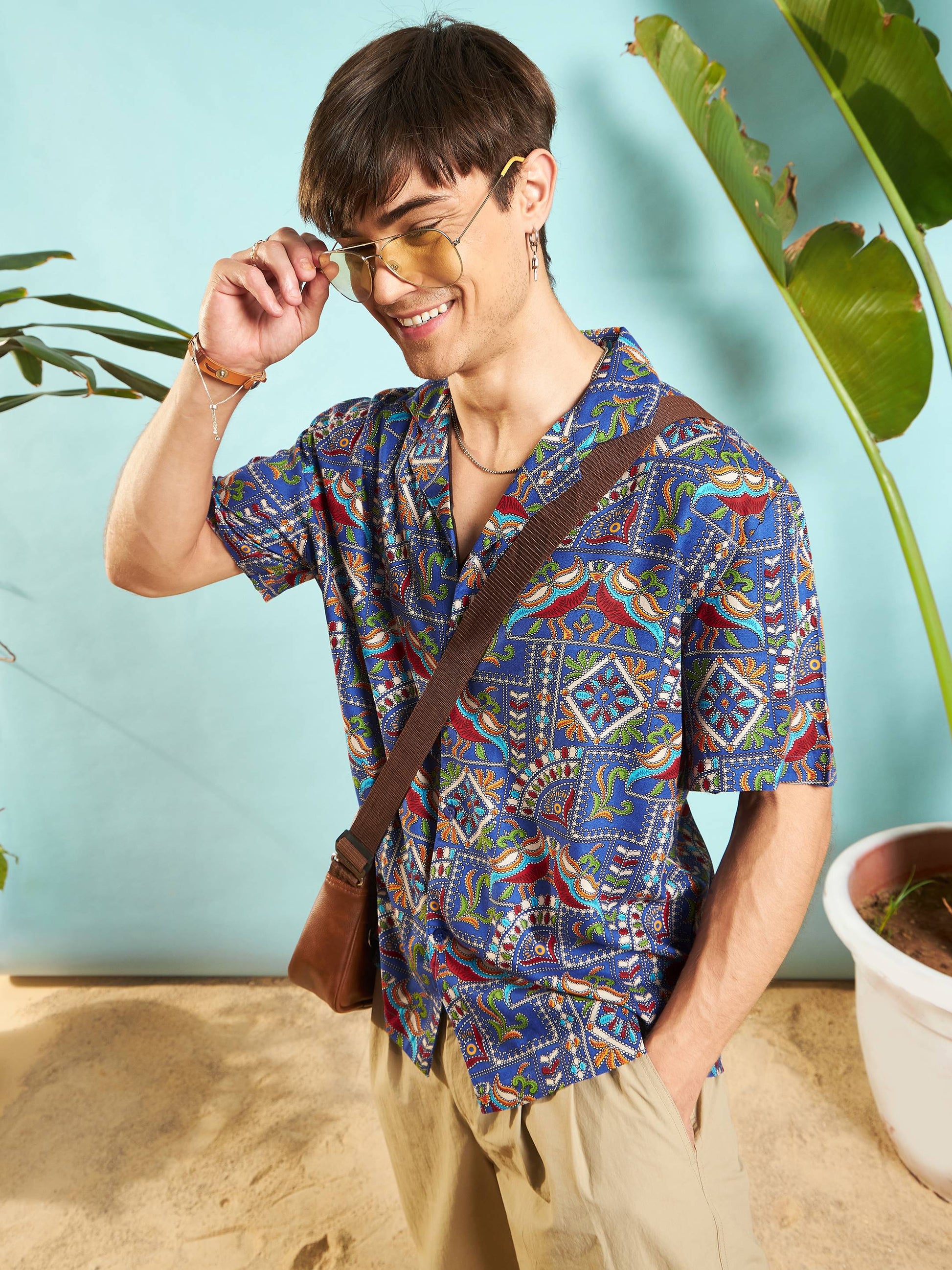 Blue Indian Print Relax Fit Shirt, in Rayon fabric, NA, Regular Length, Relax Fit, Button Closure, Straight Hemline and features Contrast Button Clouser