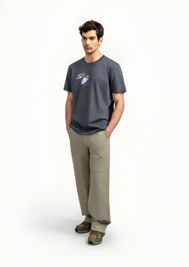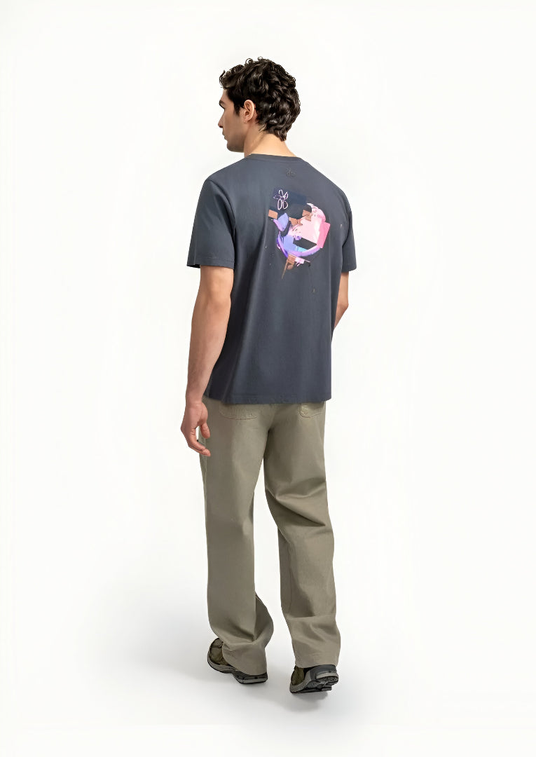 Lose yourself in a dream of light and motion with the "Neon Reverie" t-shirt. This deep midnight black tee features a vibrant front graphic of two glitch-style hands almost touching—echoing a futuristic "Creation of Adam" moment in pinks, cyans, and purples. The back art continues the story, revealing a surreal portrait of a fragmented face lost in abstract thought, adorned with geometric elements and a flower-like symbol on the head—signifying mind, chaos, and creativity.