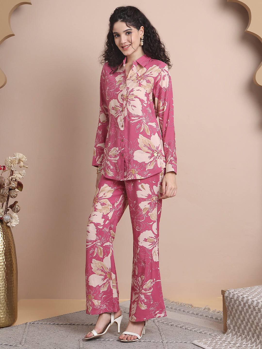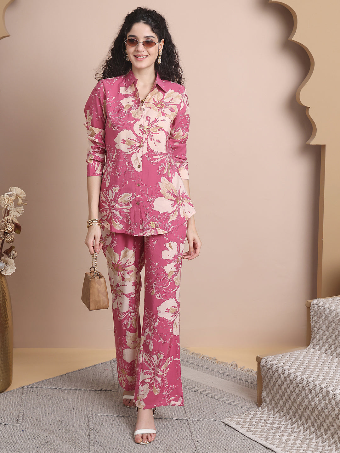 Pink Colour Floral Printed Premium Chanderi Co-ord Set For Women