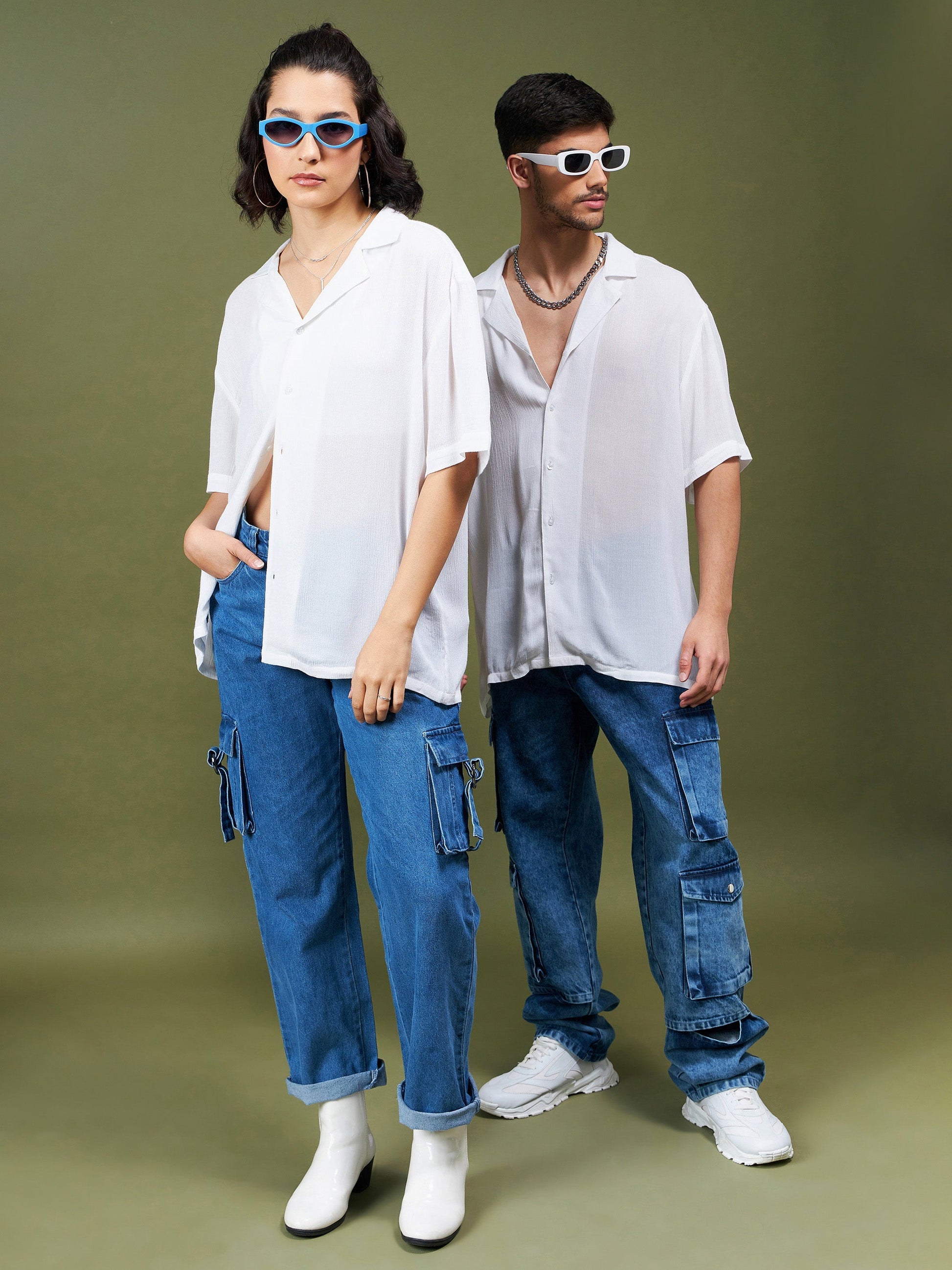 Unisex White Solid Relax Fit Shirt, in Rayon fabric, Unlined, Regular length, Relax Fit, Button Closure, Straight Hemline and features Semi-Sheer Crinkled Fabric