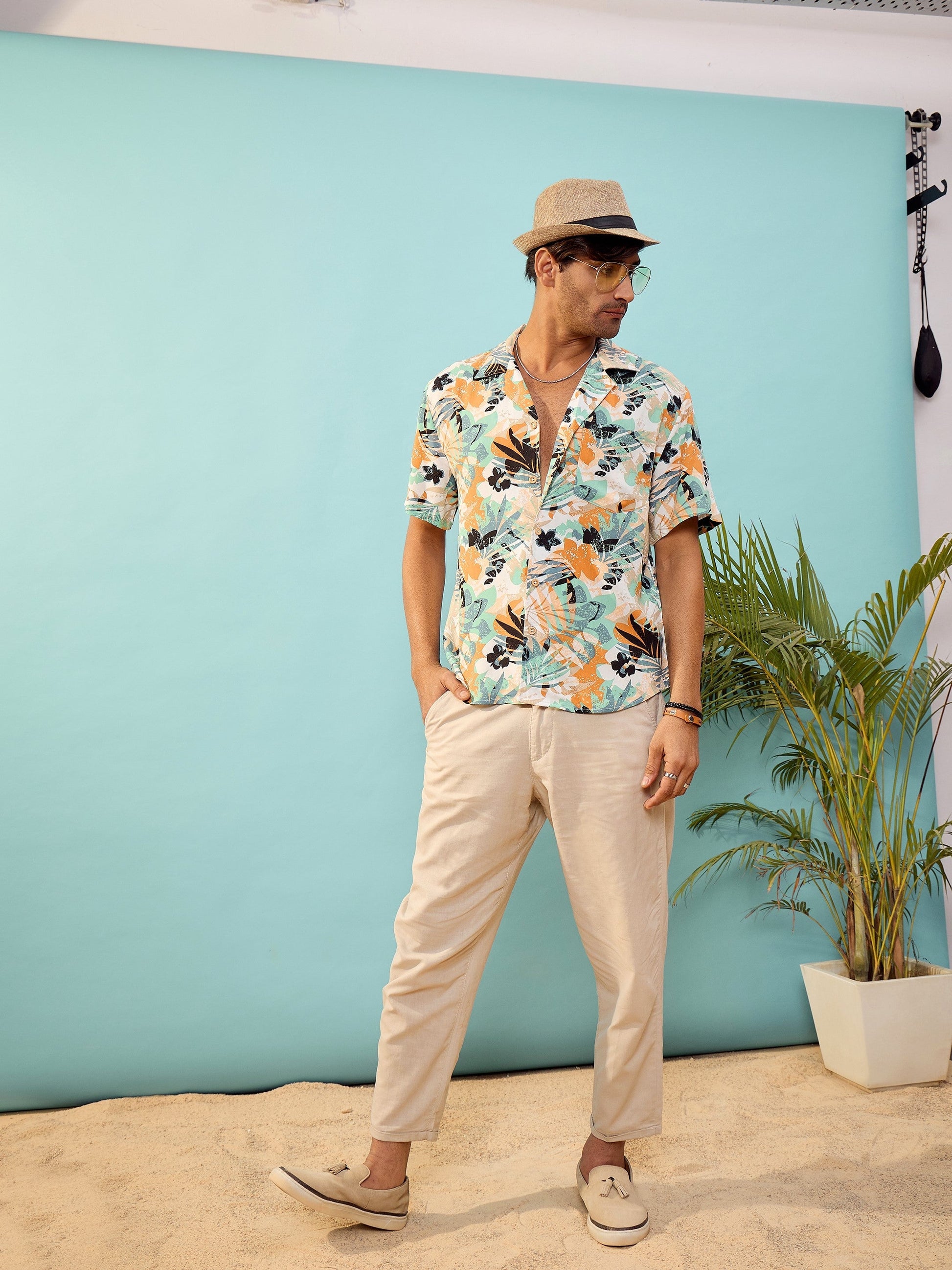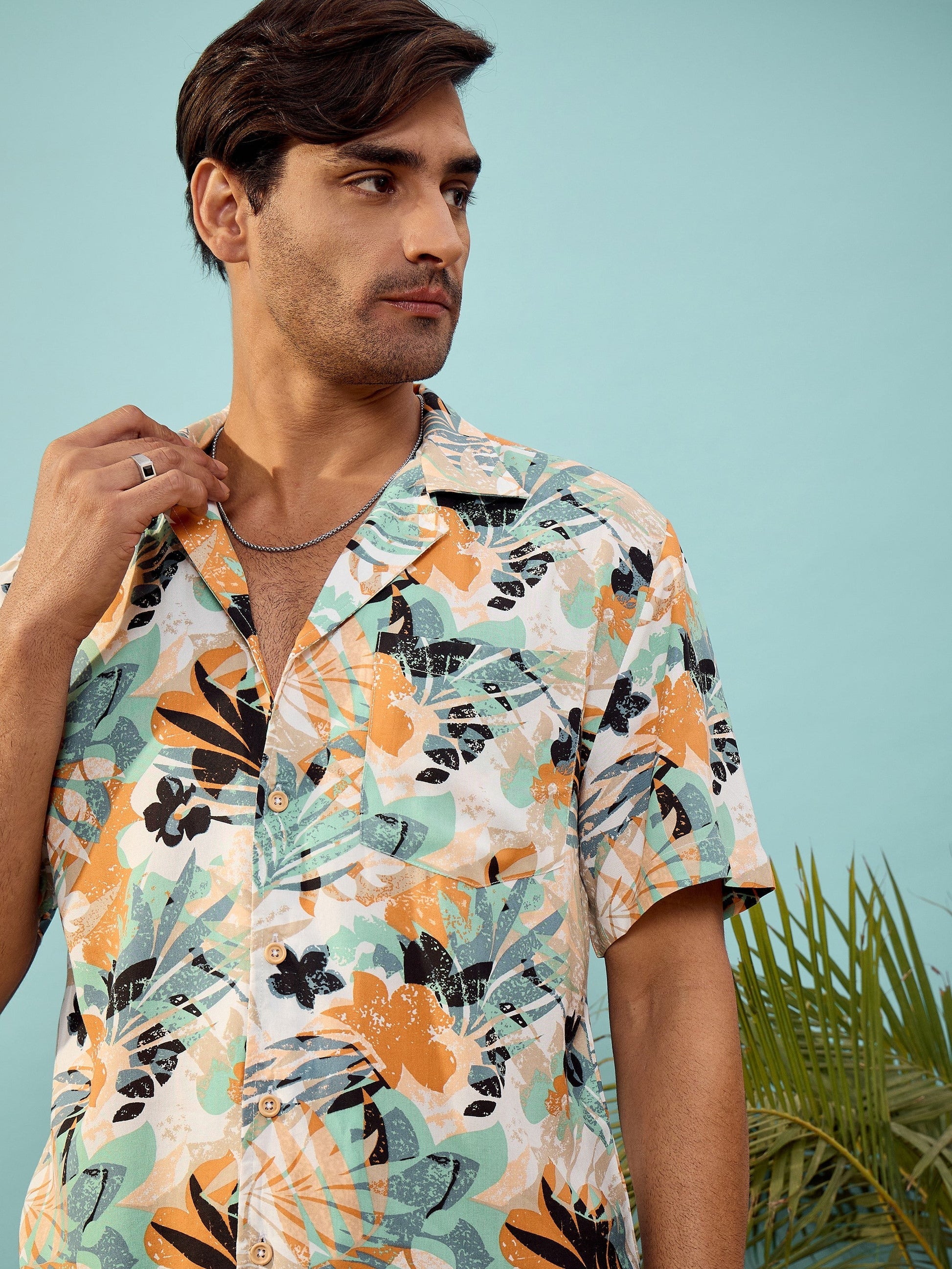 Unisex White Tropical Print Relax Fit Shirt, in Rayon fabric, Unlined, Regular length, Relax Fit, Button Closure, Straight Hemline and features Wooden Buttons Closure