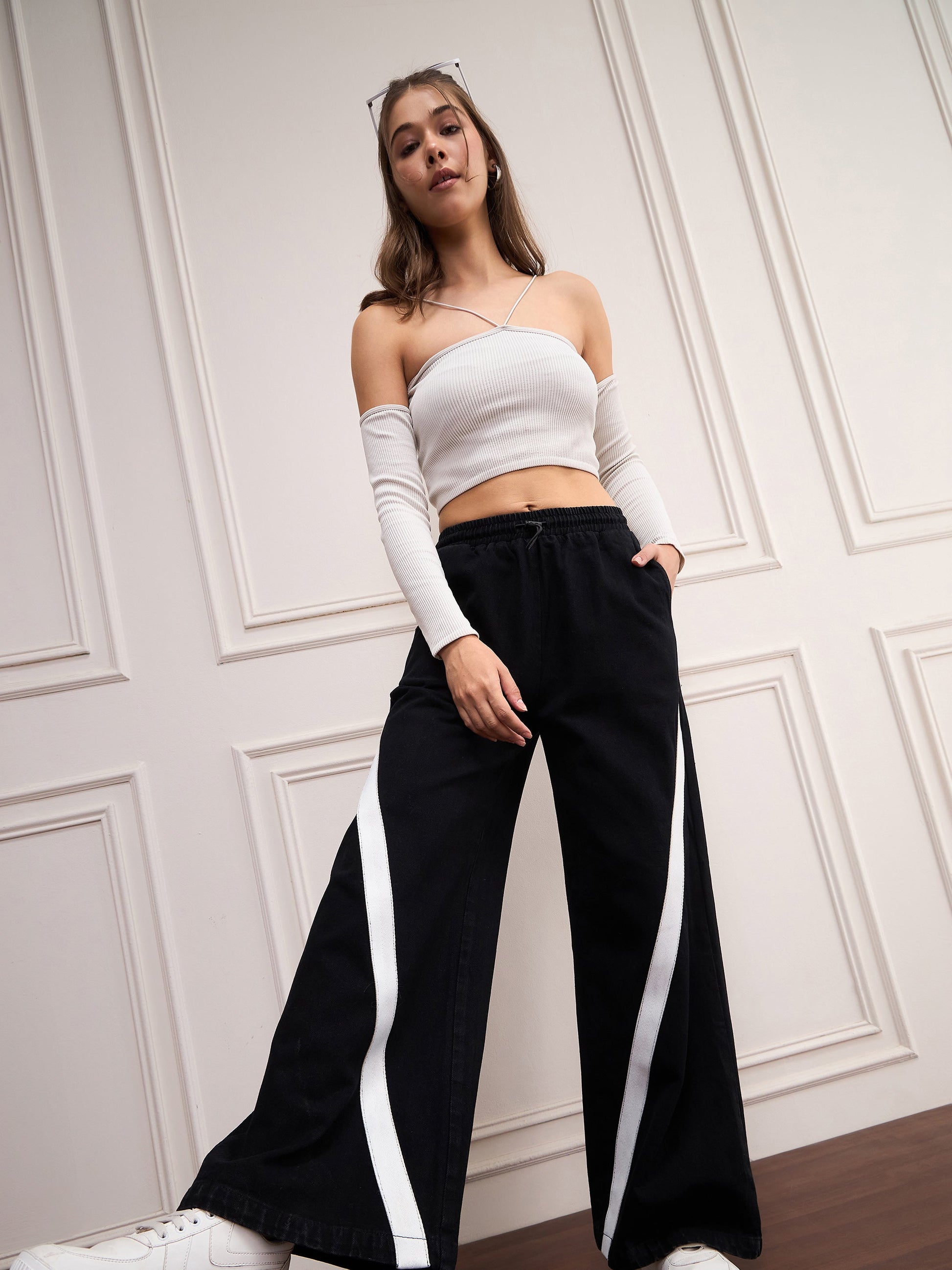 Black Denim Contrast Tape Detail Jeans, in Denim fabric, Unlined, Full Length, Comfort Fit, Elasticated, Straight Hemline and features Contrast Tape Detail At Front