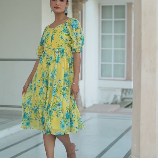 Flaunt in this stylish Yellow georgette dress in a floral pattern. It features a tiered silhouette, sweetheart-neckline, and has puff sleeves. Style them with block heels or shoes. Perfect for a day out with friends and family!